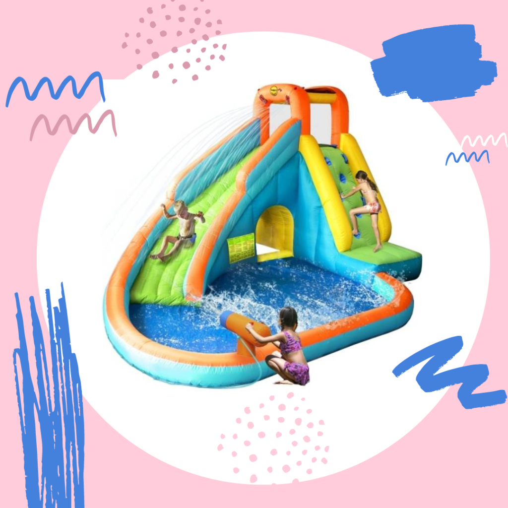 Ki ne szeretne nyáron a hatalmas hőségben egy vizes bulin részt venni? A szép, szivárvány színű csúszda tetejéről víz fröcsköl az éppen csúszó gyerekekre, akik a hűsítő vízbe csobbannak bele. Ráadásul még vízágyúval is fröcskölhetik egymást, vagy a csúszda alatti alagúton bujkálhatnak keresztül! Ki találja el suhanó társát? A légvár természetesen szárazon, víz nélkül is használható.