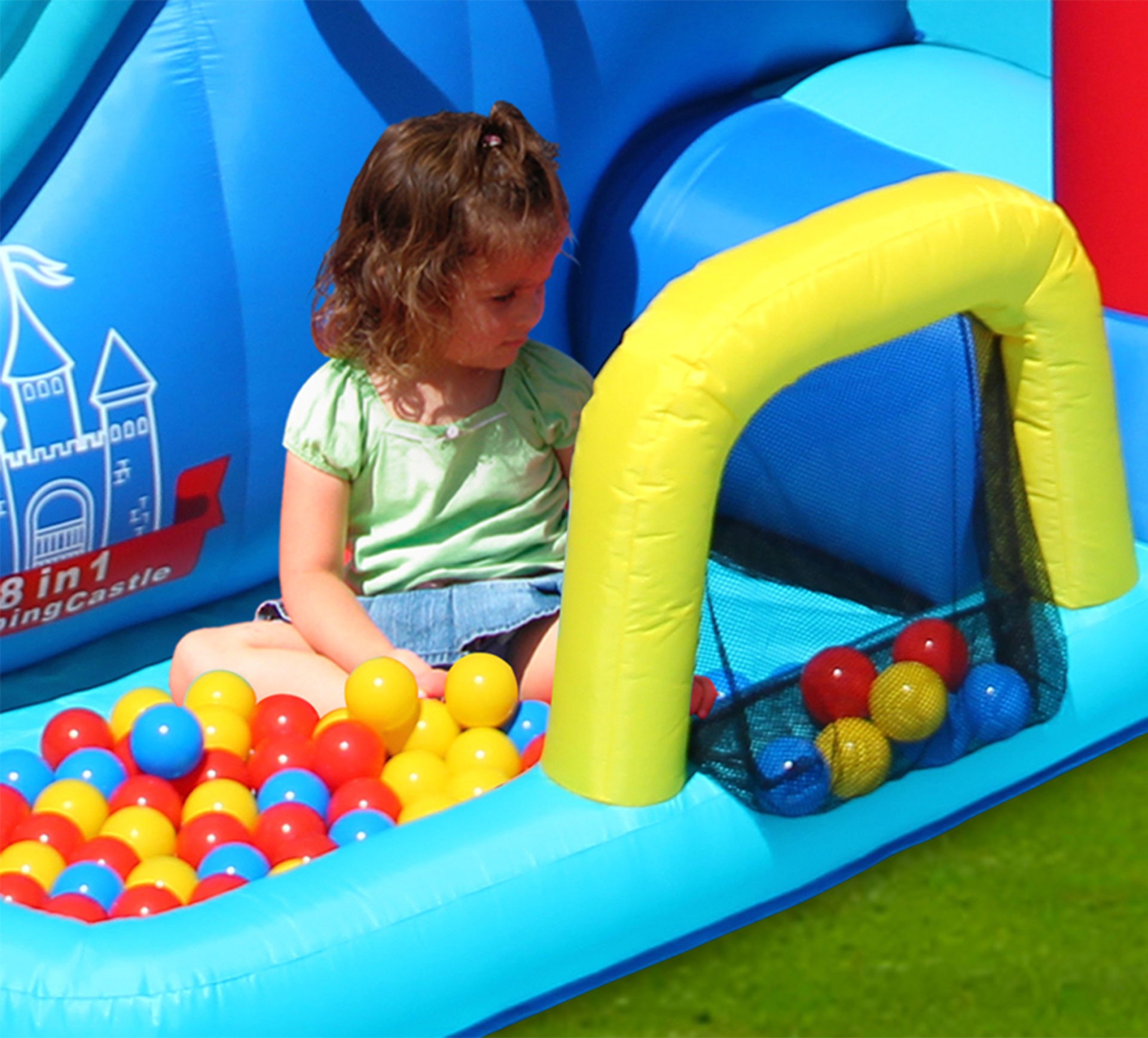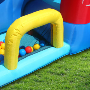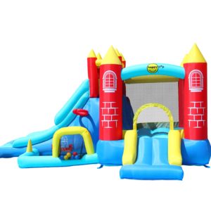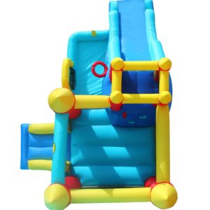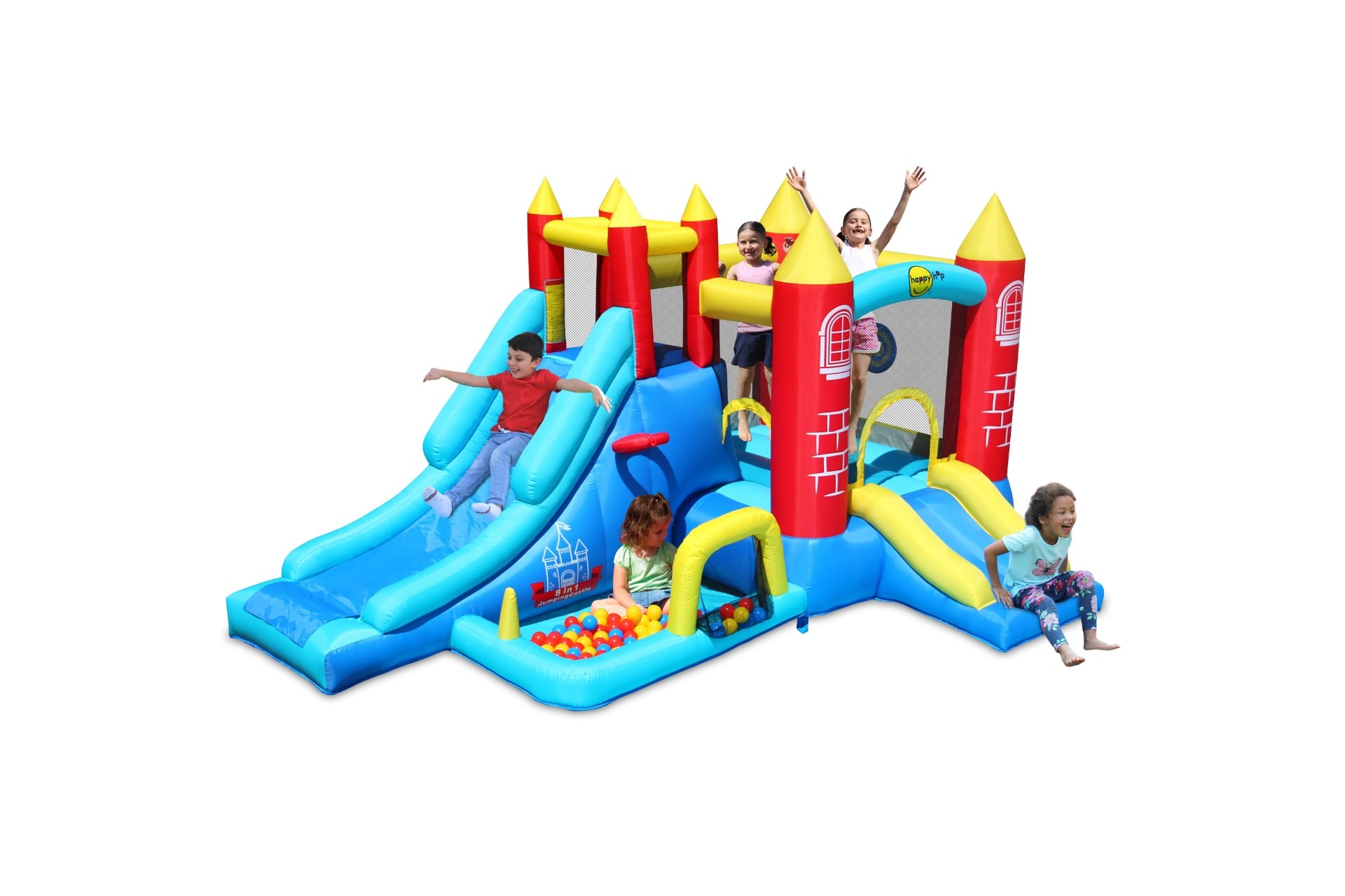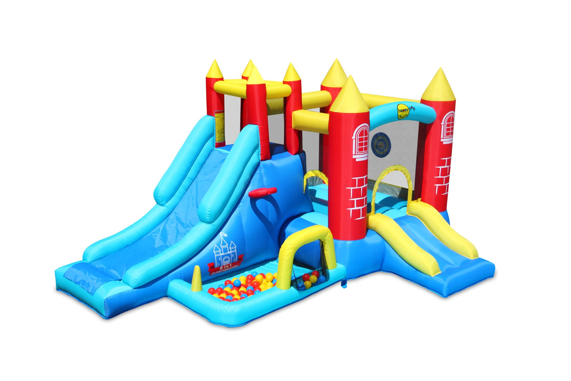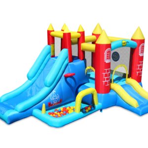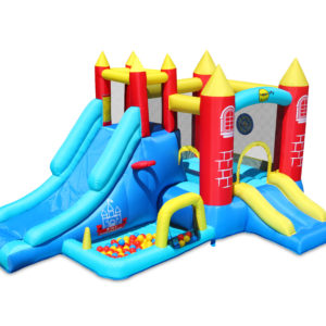 Ez a vidám színekkel, kastélyos mintával rendelkező légvár mind bel- mind kültéren kiválóan használható. A két csúszda, a kosárpalánk, a labdatenger és a különféle célbadobási lehetőségek extra élményt nyújtanak a gyerekeknek. Unalmas, esős és hideg napokon akár a szobában is felállítható.