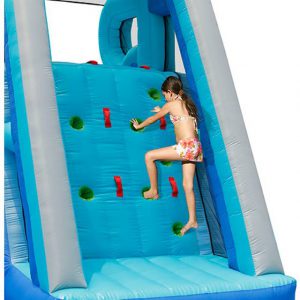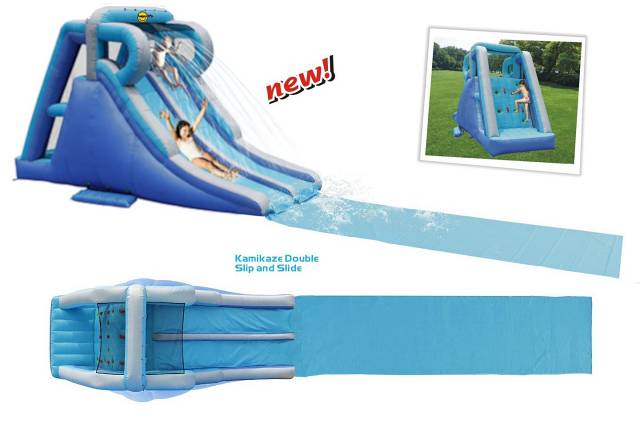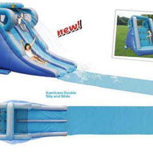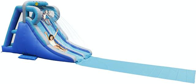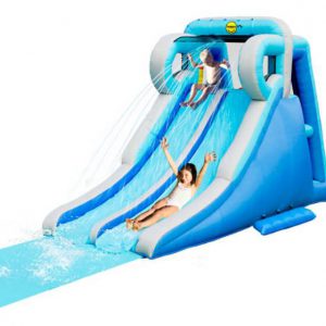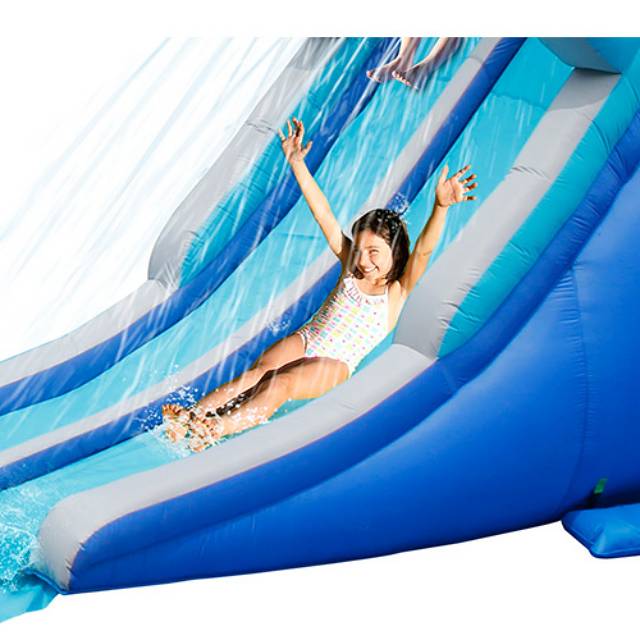 Ki ne szeretne nyáron a hatalmas hőségben egy vizes bulin részt venni? Ez a magas csúszda most még egy nagy csúszólappal is meg van hosszabbítva, így maximalizálva a csúszdázás örömét. A látványos dupla csúszda tetejéről víz fröcsköl az éppen csúszó gyerekekre, akik szuper versenyeket is rendezhetnek egymás mellett csúszva. A légvár természetesen szárazon, víz nélkül is használható.