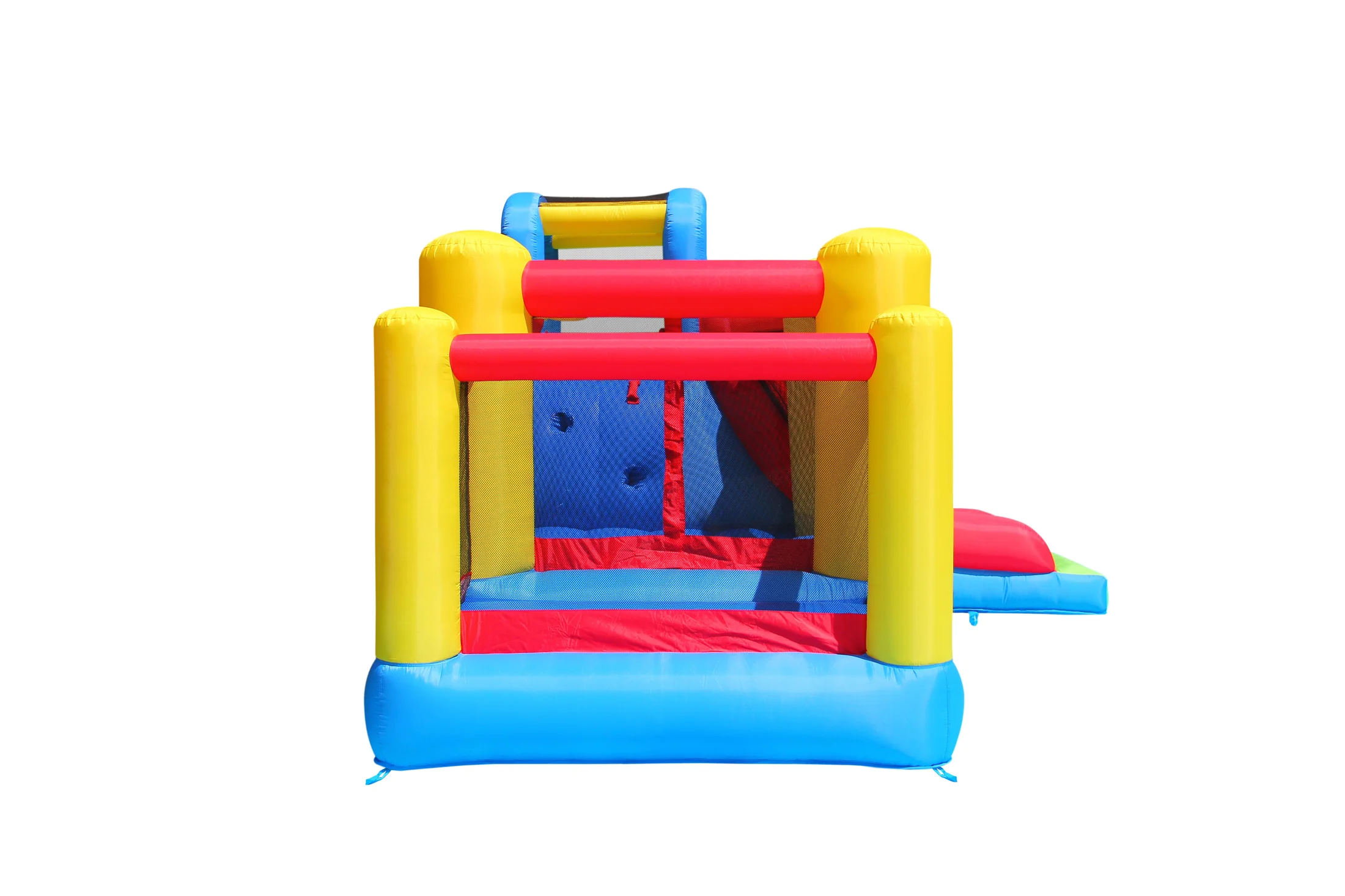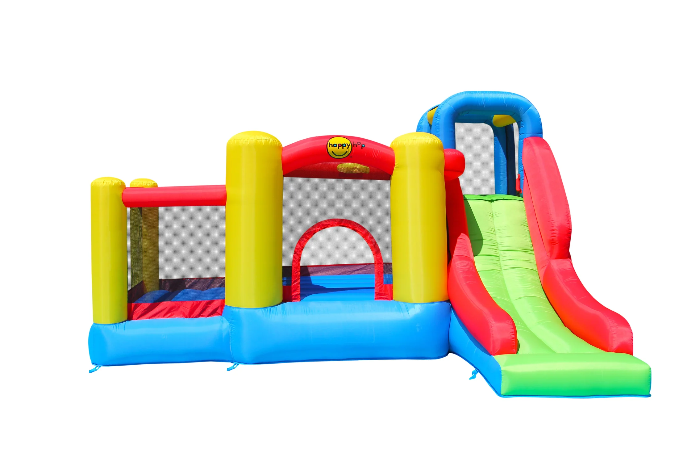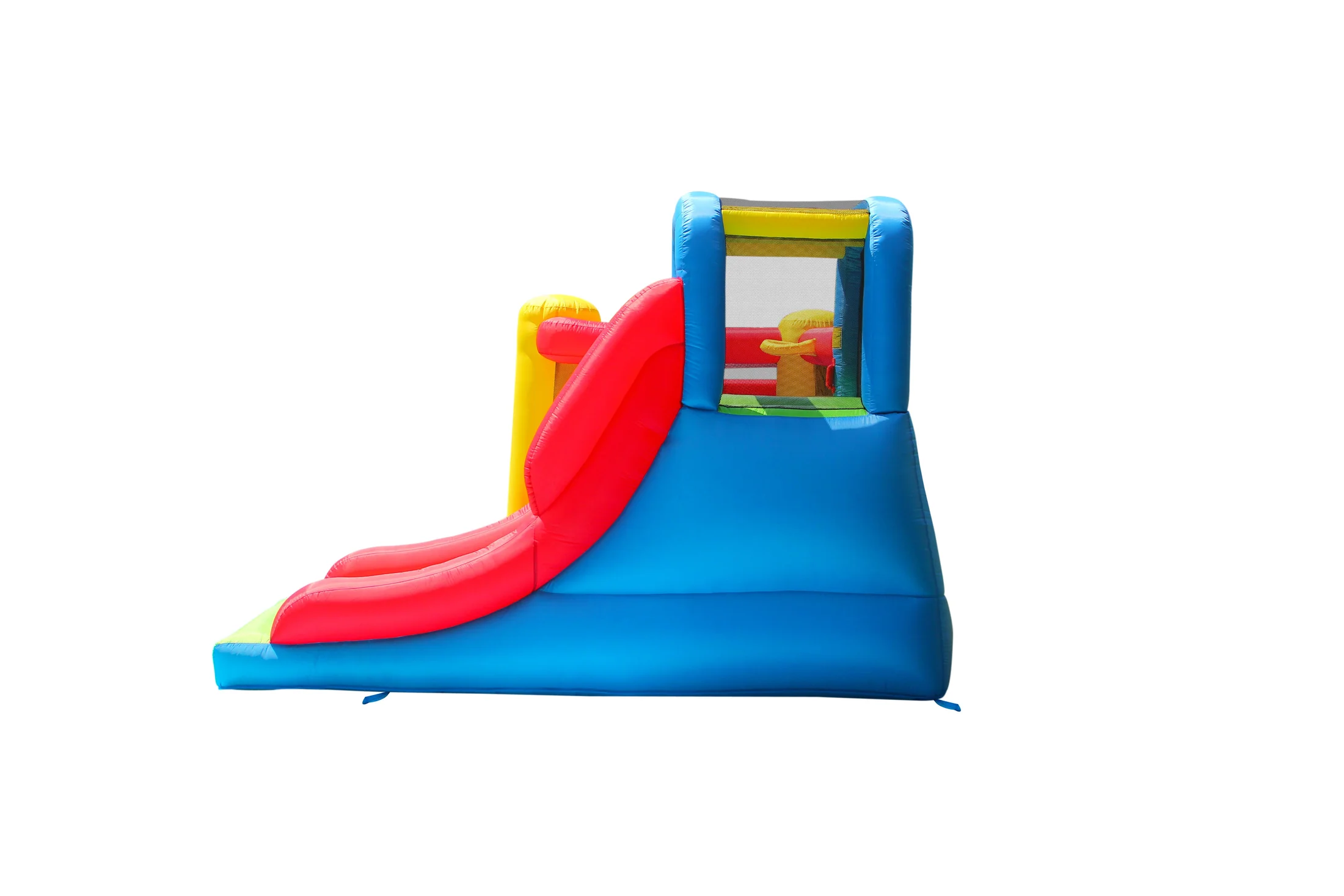 Ez a vidám sok-sok mókát ígérő kalandvár mind bel- mind kültéren kiválóan használható. Egy klassz csúszda a nagyobb testvérnek, és egy felfújható aljú labdatenger a kisebb tesónak, hogy mindenki egyszerre mulathasson – a kosárpalánk pedig csak hab a tortán. Unalmas, esős és hideg napokon akár a nappaliban is felállítható.